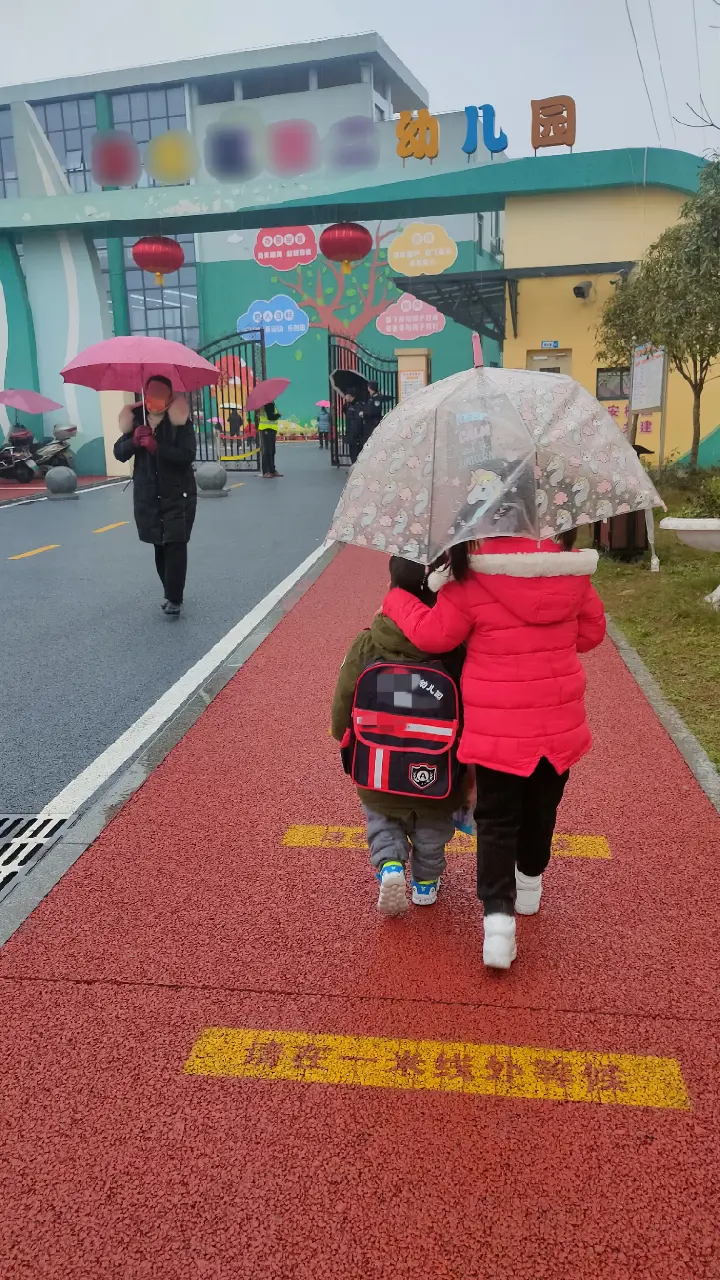 早上下着雨,爸爸送我和弟弟去上学,没有开车车,走路去幼儿园的。